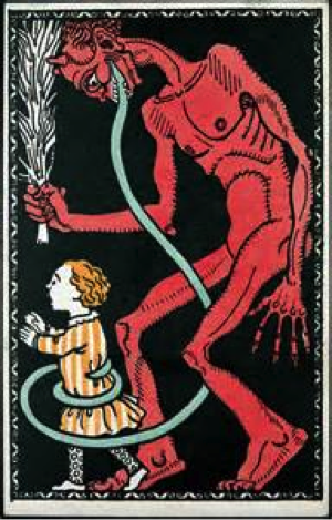 You can find out all about this tradition in the new issue of Rue Morgue (December 2015), one of the better zines out there devoted to the weird and the fantastic. Seems like the roots of the Krampus story are certainly –pre-Christian. The beast’s name is taken from the German word for claw (“Krampen”), who is said to be the son of Hel, a partially rotted Norse god who rules the Land of the Dead. Krampus’s beating stick is considered to be a pagan symbol symbol associated with witches. And perhaps the creature’s chains represent Christianity’s unsuccessful attempts to restrict and bind it.